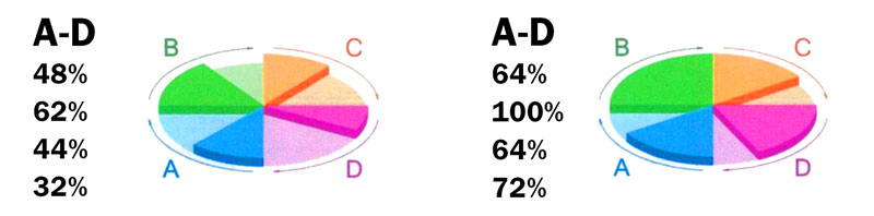 A - Adaptionsniveau (Anpassungsfähigkeit des Körpers/Resilienzmessung), B - Vegetative und C - zentrale Steuersysteme, D - Psychoemotionaler Zustand (Stresslevel). Dabei wird ausgewertet: je höher die gemessenen Daten, desto stabiler der Zustand.